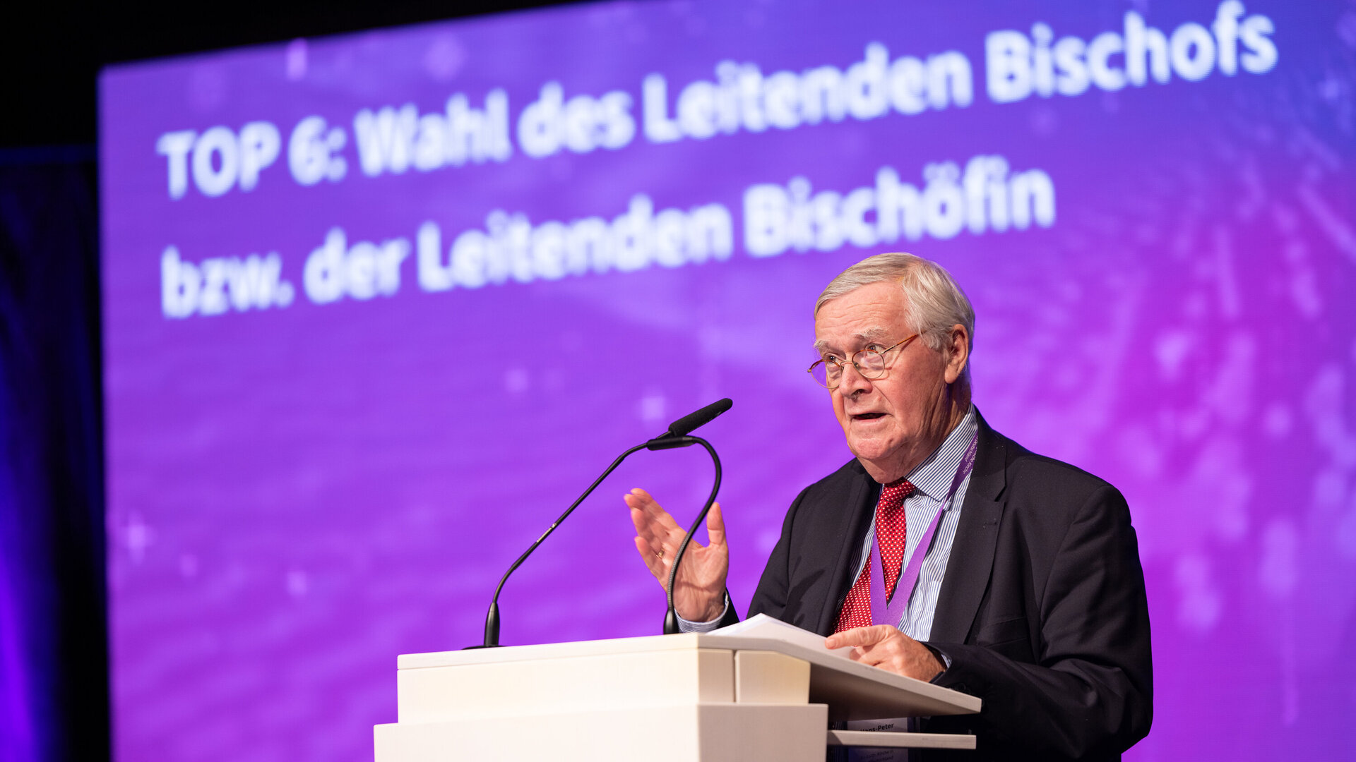 Der Vorsitzende des Bischofswahlausschusses, Hans-Peter Strenge, verkündet den Nominierungsvorschlag für das Amt des/der Leitenden Bischofs/Bischöfin. (8. November 2024)