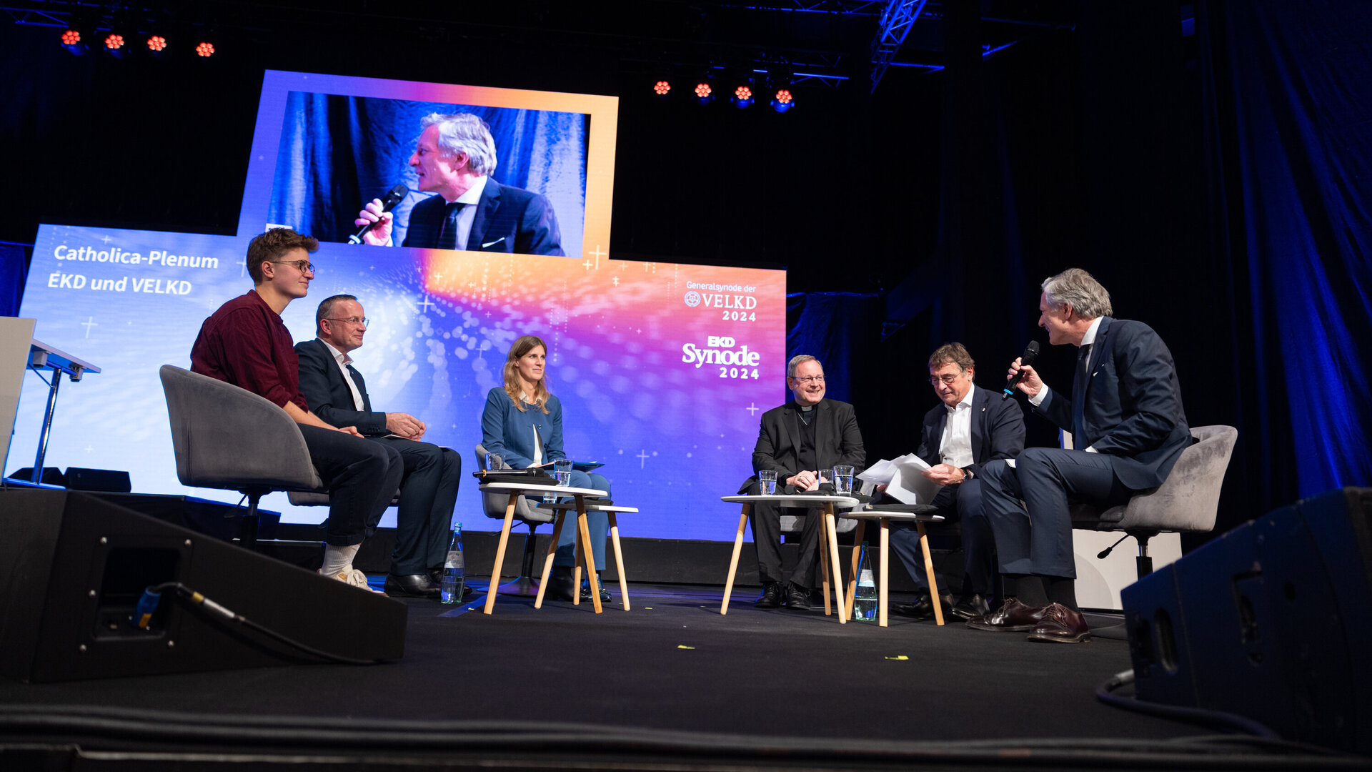 Dr. Matthias Kannengießer, Präsident der Generalsynode der VELKD, moderiert das Gespräch mit Anna-Nicole Heinrich (Präses der EKD-Synode), Landesbischof Christian Kopp (Catholica-Beauftragter der VELKD), Dr. Verena Hammes (Geschäftsführerin der Arbeitsgemeinschaft Christlicher Kirchen in Deutschland (ACK)), Bischof Georg Bätzing (Vorsitzender der DBK) und Kirchenpräsident Dr. Dr. h.c. Volker Jung (Catholica-Arbeit EKD). (10. November 2024)