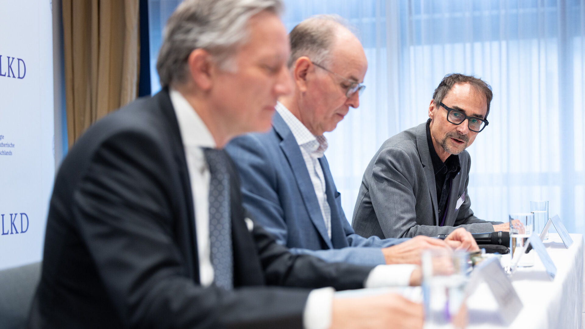 Der Präsident der Generalsynode und der Leitende Bischof der VELKD stellen sich den Fragen der Medienvertreter auf der von Dr. Dr. Frank Hofmann (Pressesprecher der VELKD) moderierten Pressekonferenz. (9. November 2024)
